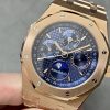 Noble watch Audemars Piguet Royal Oak series perpetual calendar watch, with its noble and elegant blue plate and cool stainless steel case, perfectly embodies Audemars Piguet’s aesthetic design and extremely high technology of complex functions.The case is made of 316L stainless steel, with a diameter of 41mm and a thickness of 11.4mm. The blue dial is engraved with the “Grande Tapisserie” large plaid decoration. The blue dial has three-dimensional hour markers and faceted hands covered with luminous coating. Three sub-dials showing the calendar function and the moon phase display are symmetrically distributed on the dial, showing hours, minutes, day of the week, date, weekly calendar, month, moon phase and leap year information in an orderly manner. Really the only version. Sapphire anti-glare treatment makes the overall watch more transparent and bright.
