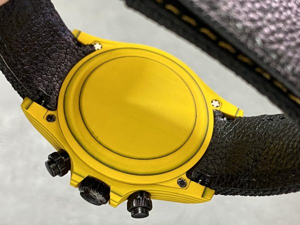 N6 factory new product Super NTPT carbon fiber Diw customized version 4130 Universe Chronograph Daytona series. The diameter of the watch is 40MM, which is the same size as the ordinary Daytona. The entire watch weighs 53 grams. The entire watch case is made of carbon fiber. Carbon fiber material is a new type of material. The color is timeless black, and the overall texture is very elegant and luxurious. Carbon fiber is soft on the outside and rigid on the inside. It is lighter than metal aluminum, but stronger than steel, and is corrosion-resistant. The matte black case has various textures, and each carbon fiber watch will show different textures due to different cutting methods, making it unique. The strap is a Velcro design, made of nylon on the front, cowhide on the back, and the buckle is also made of carbon fiber.
